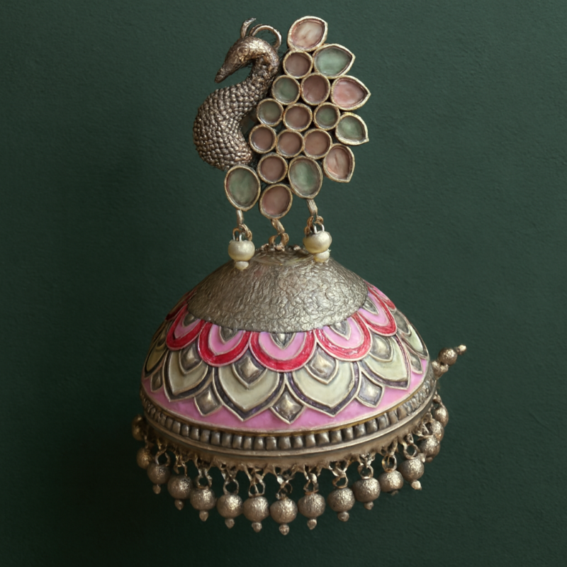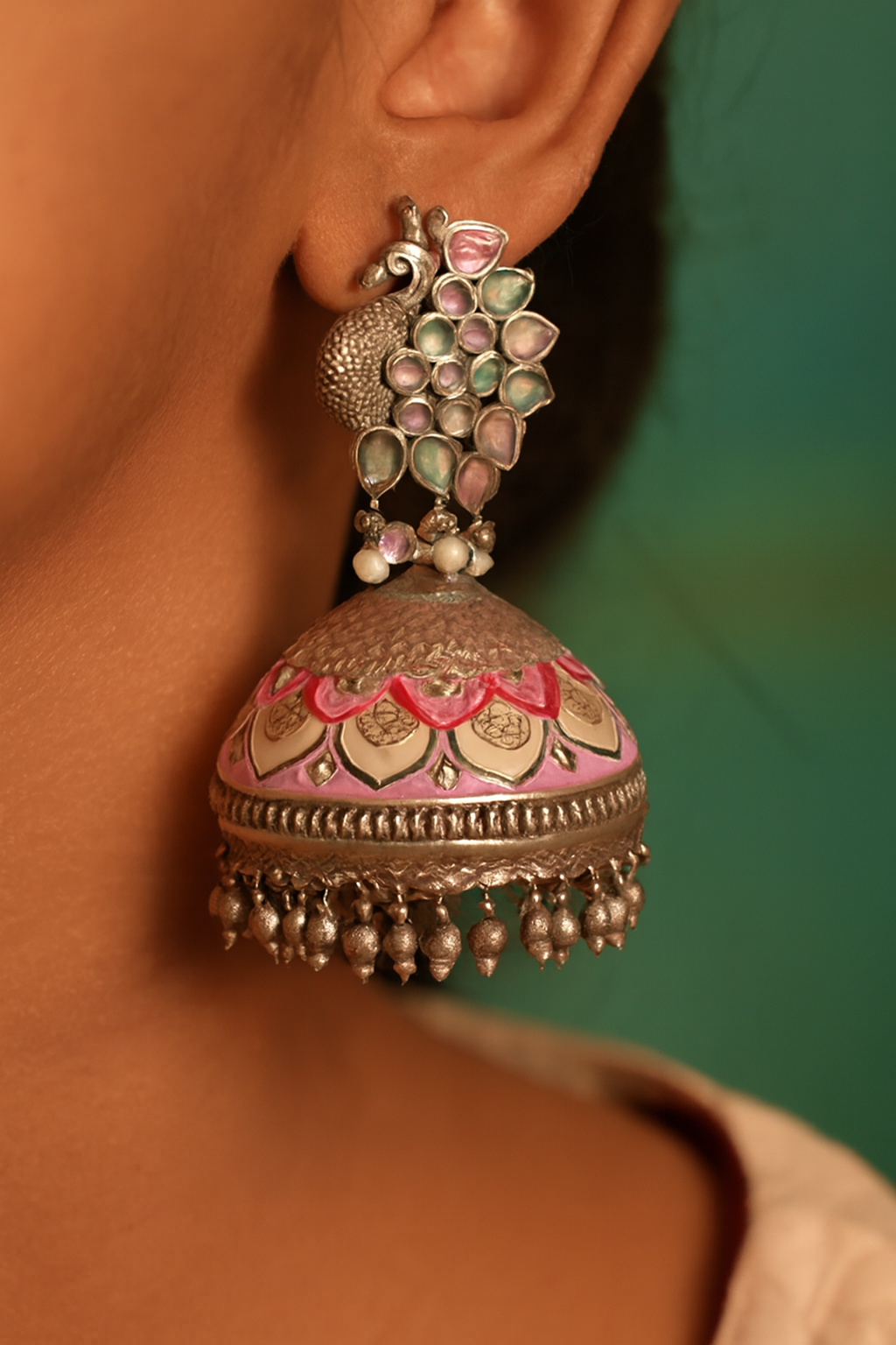 Light-weight oxidized silver jhumkay with hand paint detailing.
