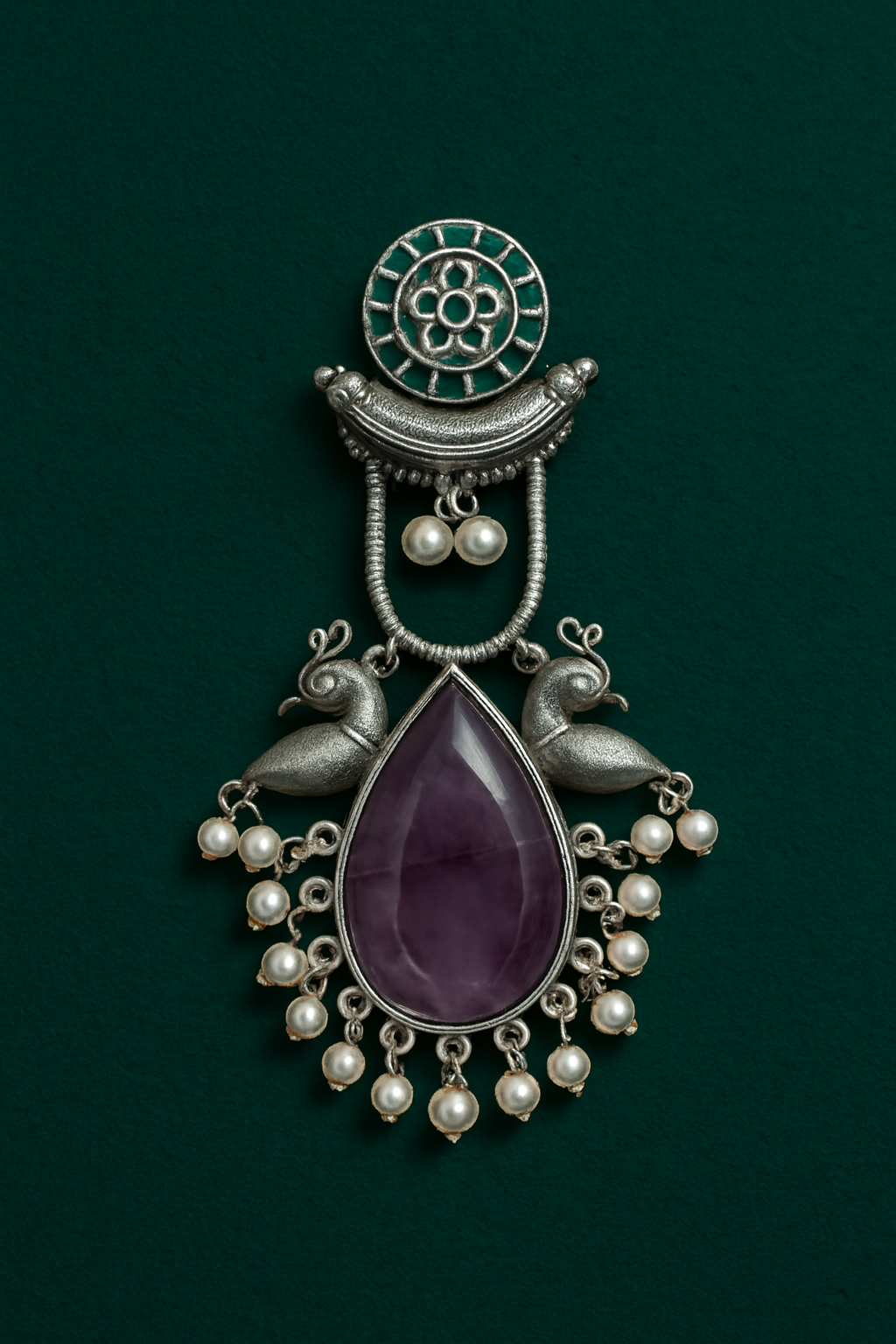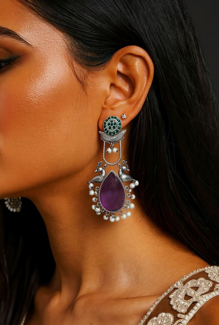 Light weight oxidized silver earrings with intricate detailing and stonework.