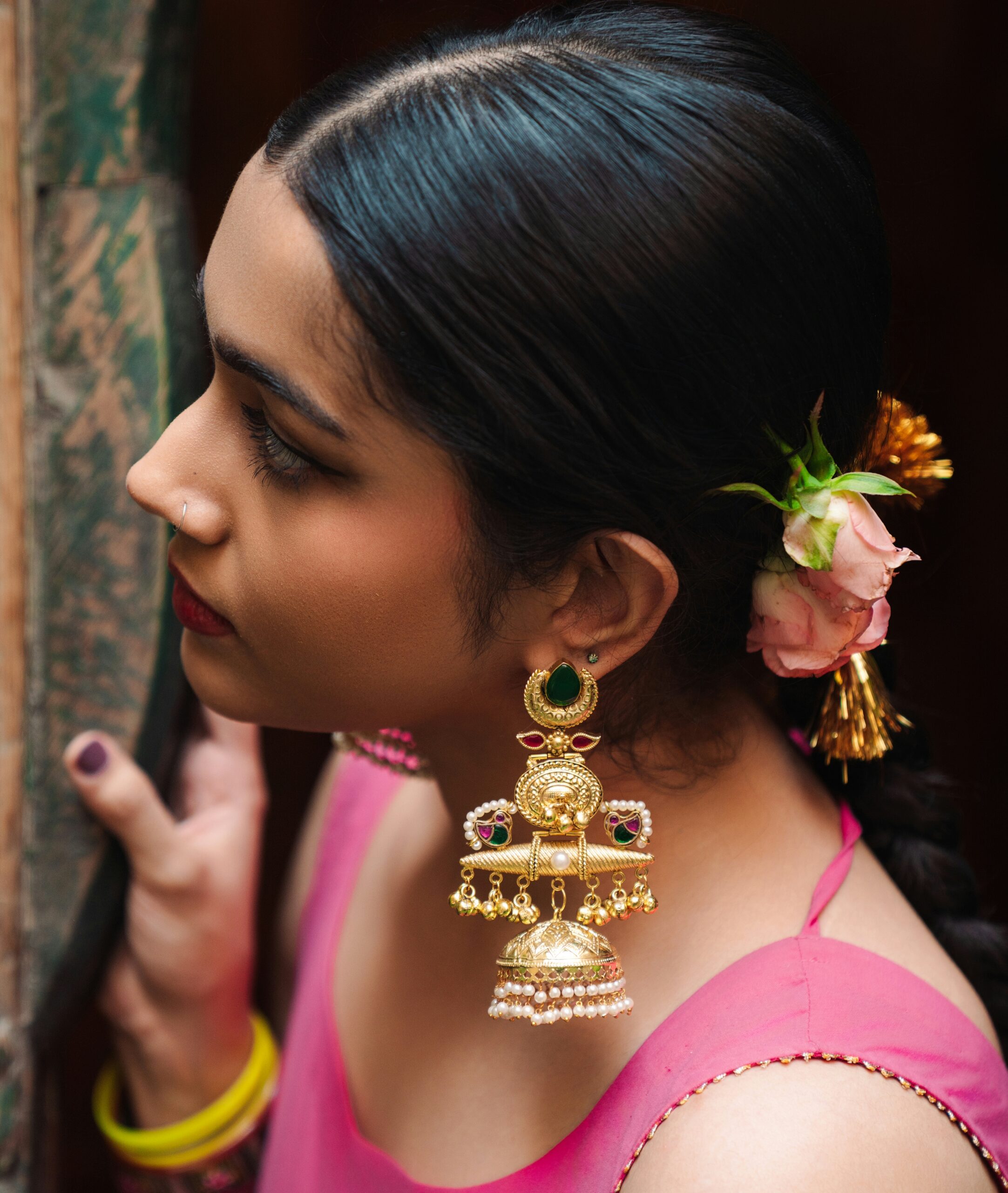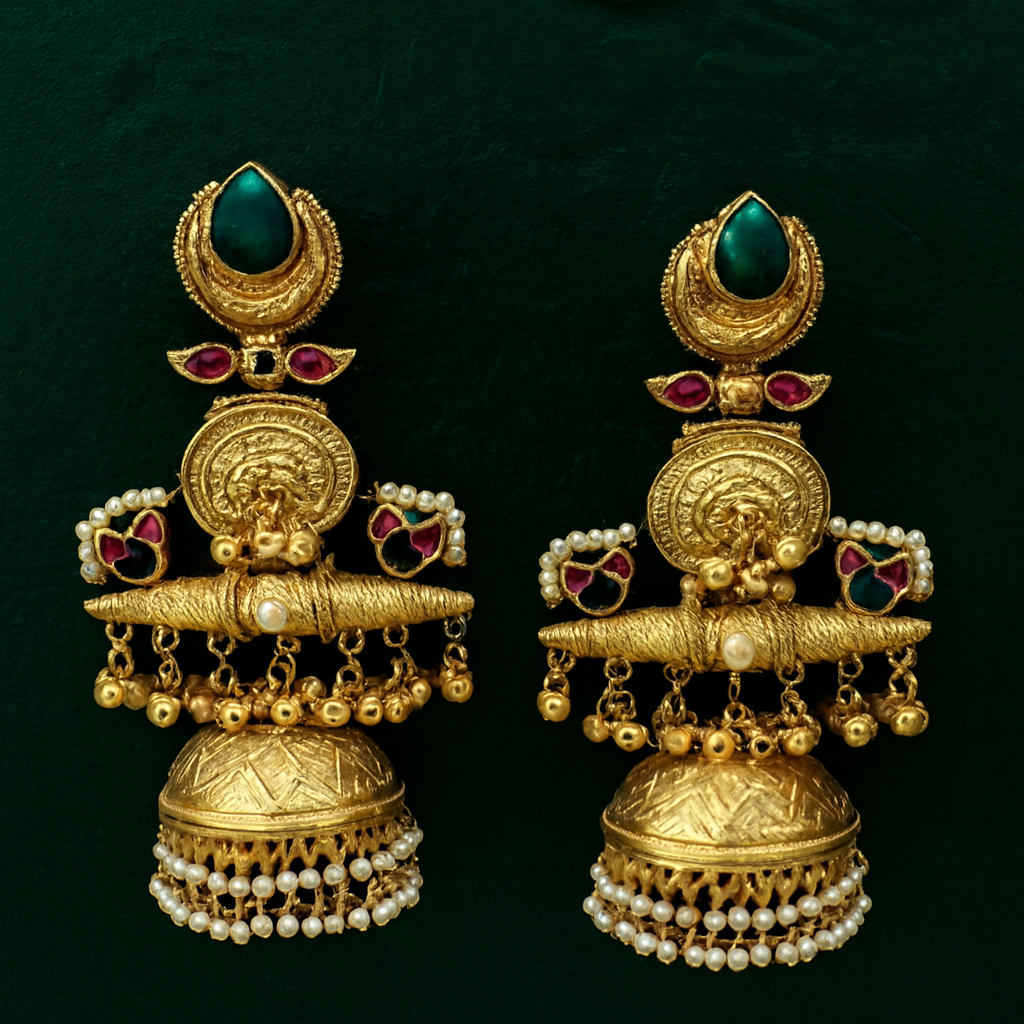 Lightweight oxidized silver earrings in gold polish with intricate bead and kundan work