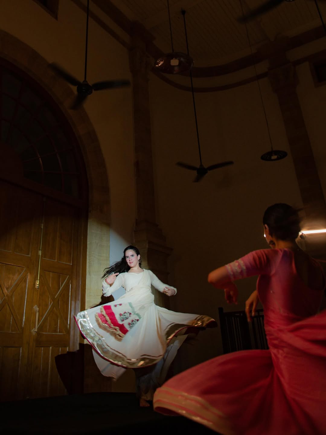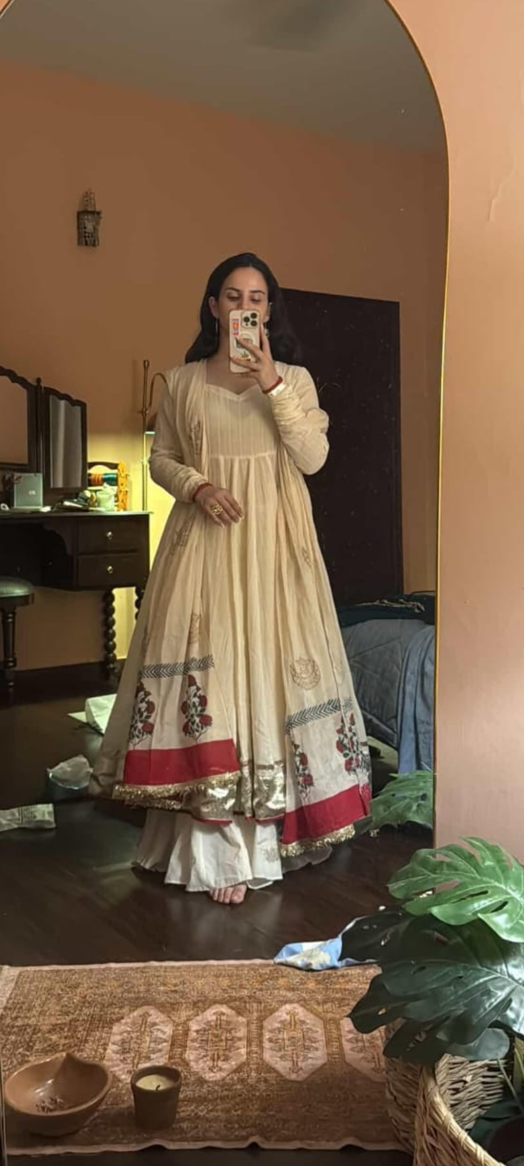 Handwoven cotton kalidaar paired with lucknowi gharara and handblock printed cotton dupatta