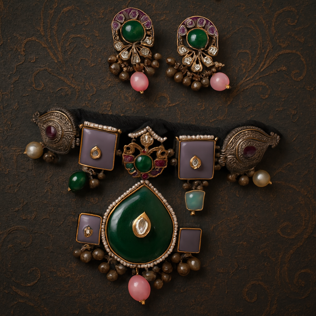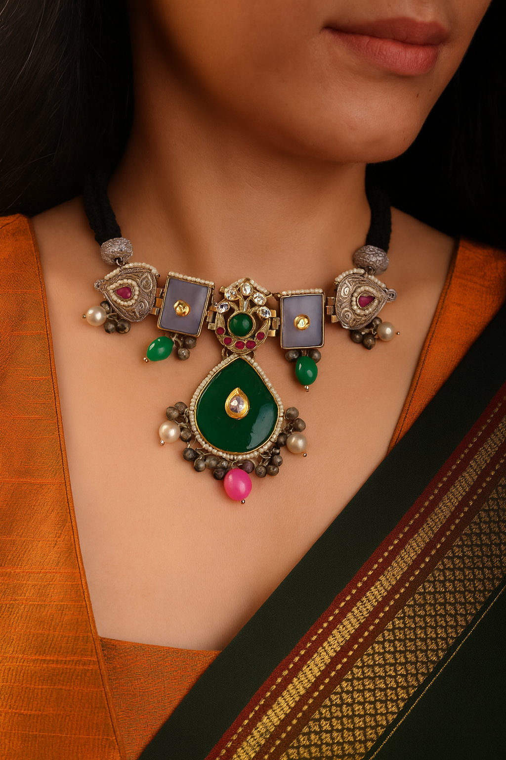 Light weight oxidized silver choker set with jurrao stone detailing.